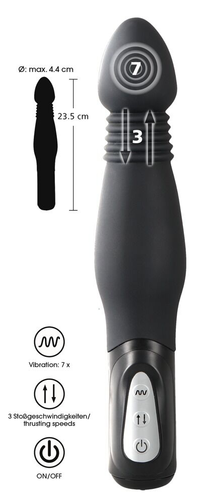 Вибратор с имитацией толчков! Анальный вибратор с конусообразным наконечником и луковичной формой оснащён 7 режимами вибрации и 3 скоростями толчков, которыми можно управлять отдельно. Тонкий кончик облегчает введение, мягкое покрытие Soft-Touch обеспечивает комфорт. Общая длина 23,5 см, глубина введения 15,5 см, диаметр 2,5–4,4 см. Материалы: силикон с полиуретановым покрытием, ABS. Батарейки 3 × AAA заказываются отдельно.