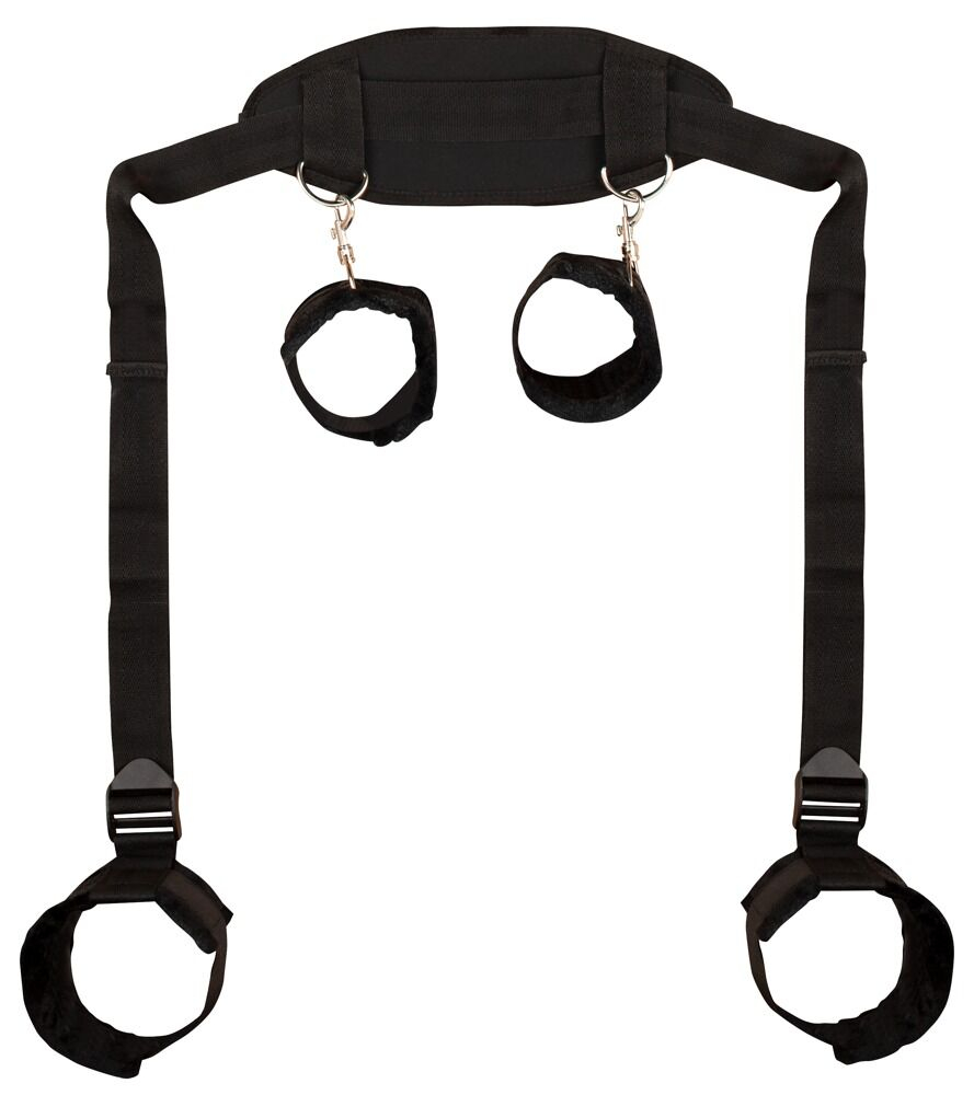Комбинированный бондажный набор для фиксации шеи, запястий и лодыжек. Манжеты с мягкой плюшевой подкладкой обеспечивают комфорт, а прочные застежки-липучки позволяют точно регулировать размер. Ремни к лодыжкам регулируются по длине, наручники отсоединяются от шейной манжеты с помощью карабинов. В комплект входит маска для глаз для усиления ощущений. Длина наручников: 33 см. Длина манжет на лодыжки: 38 см. Длина ограничительных ремней: 188 см. Цвет: черный. Вес: 360 г. Материалы: полиэстер, полипропилен, PU, ABS, металл.