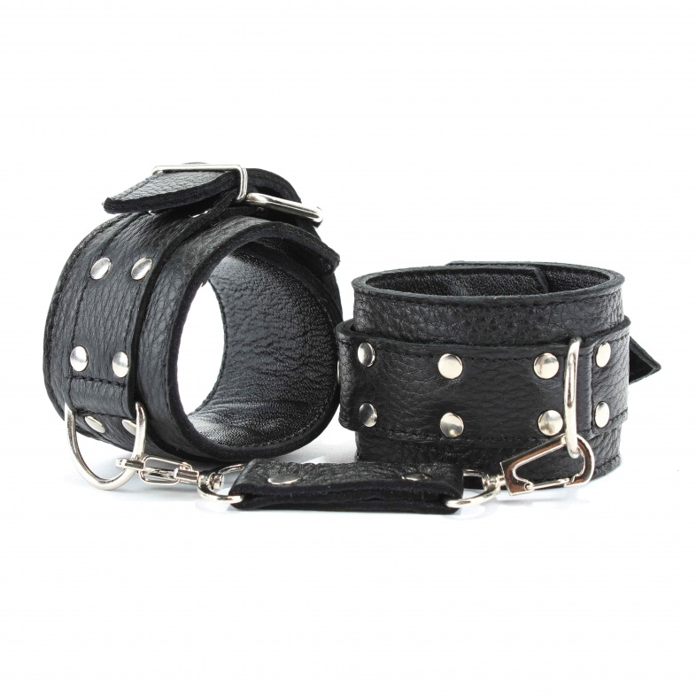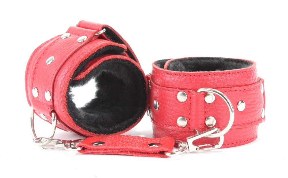 Оковы выполнены из натуральной кожи бордового цвета. Изделие декорировано ремнями из замши черного цвета. Посредине аксессуара расположено полукольцо из сварной фурнитуры. Оковы надежно фиксируются пряжками и ремнями, позволяющими выбрать нужный размер, кожаное соединение на карабинах фиксирует оковы вместе. Стильный аксессуар отлично подходят для воплощения эротических БДСМ игр.