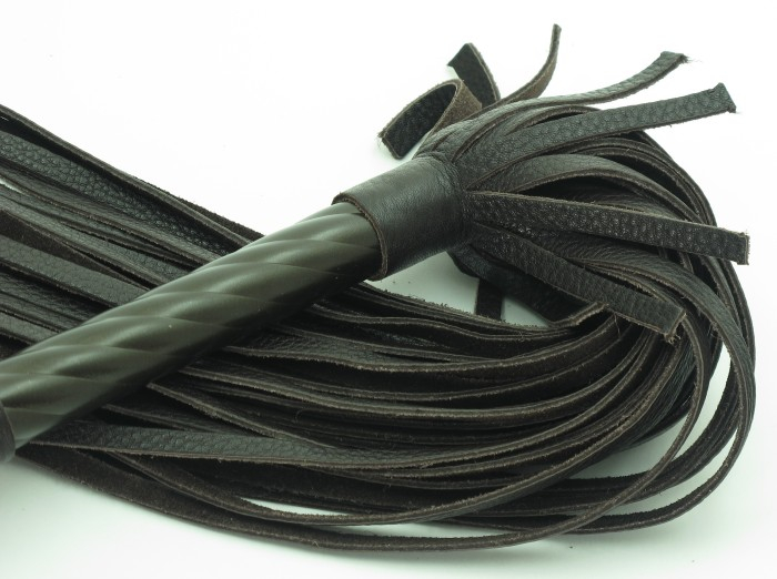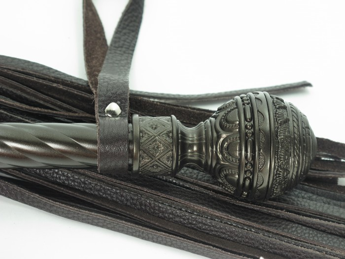 Величественная плеть из натуральной кожи, с жесткой рукояткой, украшенной эксклюзивным кованым скипетром.Имеет удобную петлю для комфортного использования. Длина рукоятки - 22,5 см., длина хлыстов - 40 см.