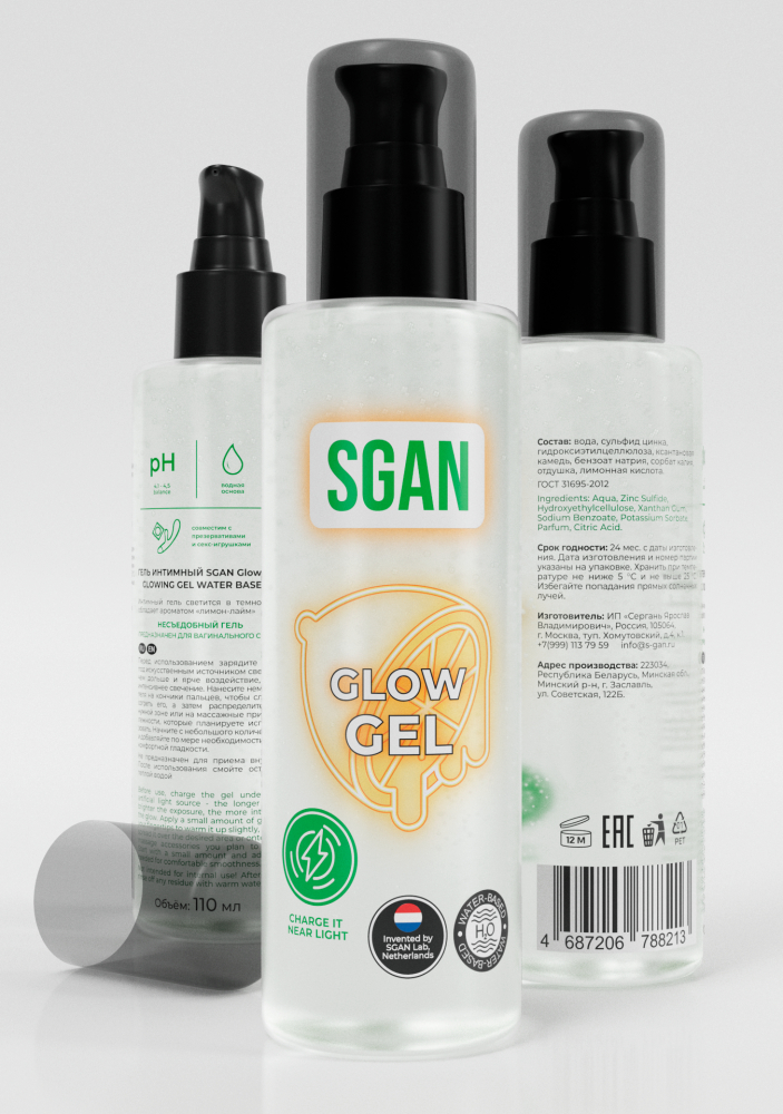 Интимный гель на водной основе “SGAN GLOW GEL” с эффектом свечения разработан сексологами в Нидерландах. Уникальная формула с частицами сульфида цинка создает завораживающий эффект неонового свечения, превращая интимную близость в незабываемое зрелище. Это полностью безопасный и инертный компонент, который обеспечивает потрясающий визуальный эффект, не нарушая нежную микрофлору. Состав: Вода, сульфид цинка, гидроксиэтилцеллюлоза, ксантановая камедь, бензоат натрия, сорбат калия, отдушка, лимонная кислота.