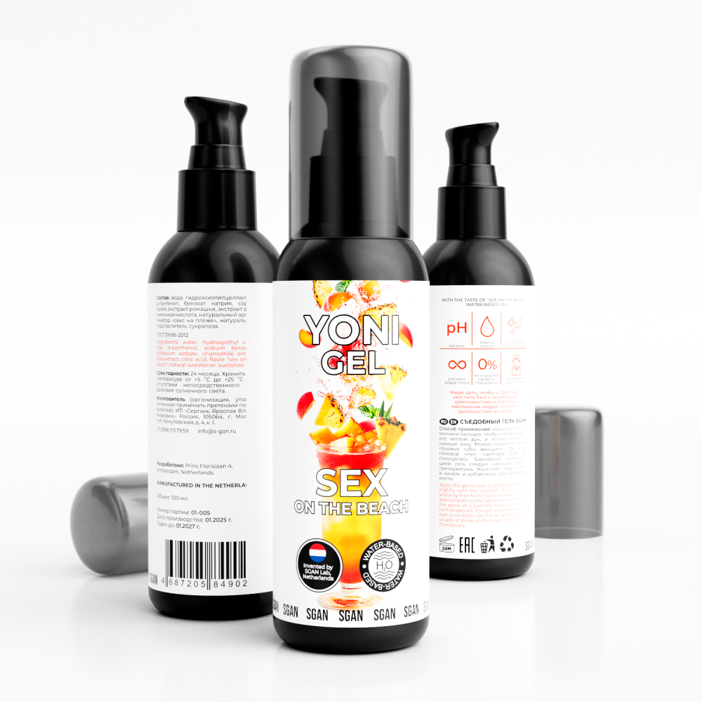Лубрикант на водной основе “SGAN” со вкусом коктейля Секс на пляже разработан сексологами в Нидерландах. Разработана с учетом физиологии, совмещает в себе вкус и аромат, при этом сохраняет все регенерирующие свойства классического лубриканта. Не оставляет липкости, без химического привкуса, не содержит сахара и калорий. Абсолютно безопасен для проникновения и при проглатывании. Сохраняет естественный pH баланс слизистых, не вызывает жжения и неприятных ощущений. Не содержит парабенов, силиконов, масел и красителей. Совместим абсолютно со всеми игрушками и презервативами, не разрушает их структуру, так как не содержит масел и силиконов.