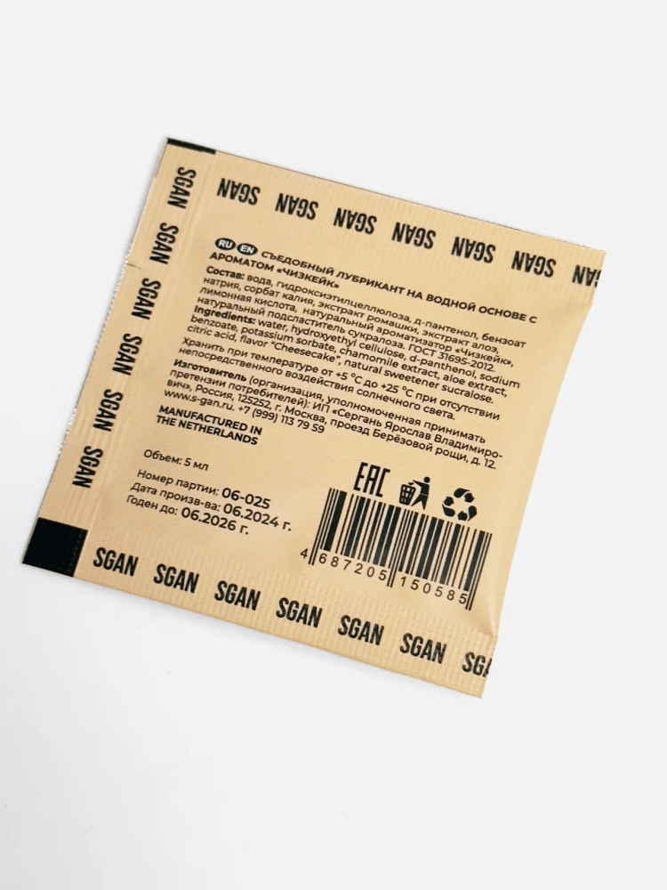Лубрикант на водной основе “SGAN” со вкусом чизкейка разработан сексологами в Нидерландах. Разработана с учетом физиологии, совмещает в себе вкус и аромат, при этом сохраняет все регенерирующие свойства классического лубриканта. Не оставляет липкости, без химического привкуса, не содержит сахара и калорий. Абсолютно безопасен для проникновения и при проглатывании. Сохраняет естественный pH баланс слизистых, не вызывает жжения и неприятных ощущений. Не содержит парабенов, силиконов, масел и красителей. Совместим абсолютно со всеми игрушками и презервативами, не разрушает их структуру, так как не содержит масел и силиконов.