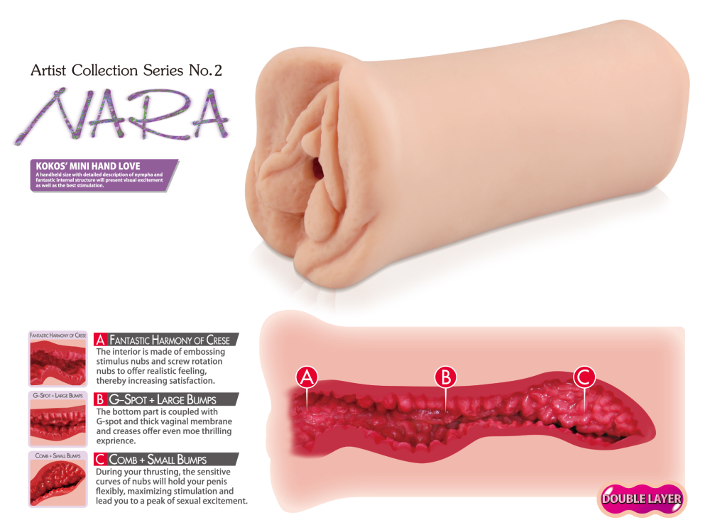 Мастурбатор KOKOS Nara из коллекции Artist Collection Series No.2 с двухслойной конструкцией. Внутренняя поверхность разделена на три зоны: продольные ребра, крупные рельефные шарики в зоне G-Spot и мелкие шарики в нижней части канала. Узкое основание создаёт вакуумный эффект, усиливая ощущения. В основании предусмотрено небольшое отверстие для регулировки давления. Реалистичный внешний вид, детализированный вход. Длина изделия — 16 см, диаметр — 7 см, ширина — 5 см. Вес — 370 г. Производство: Южная Корея. Упаковка: фирменная коробка.