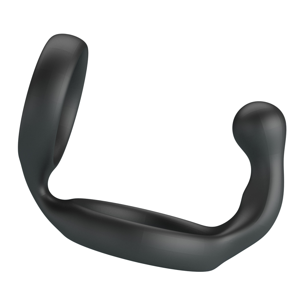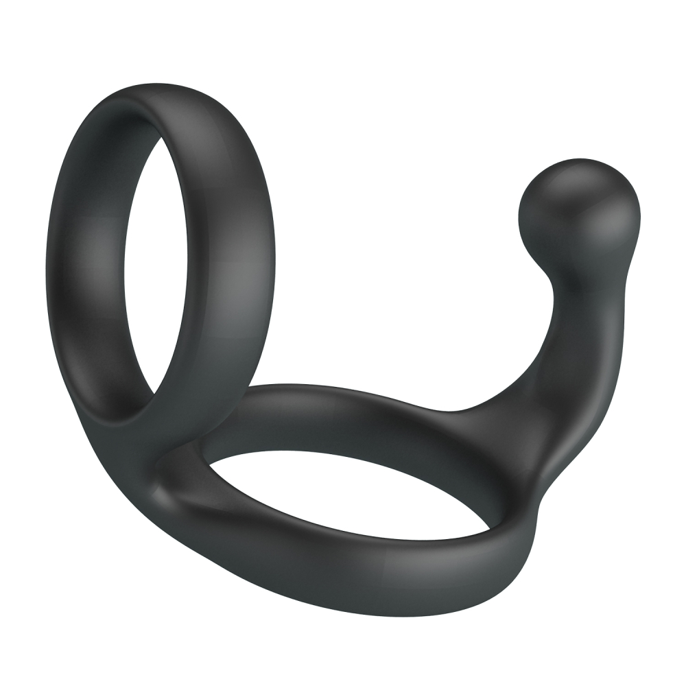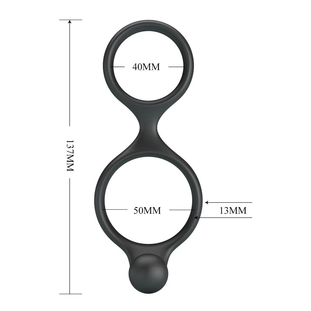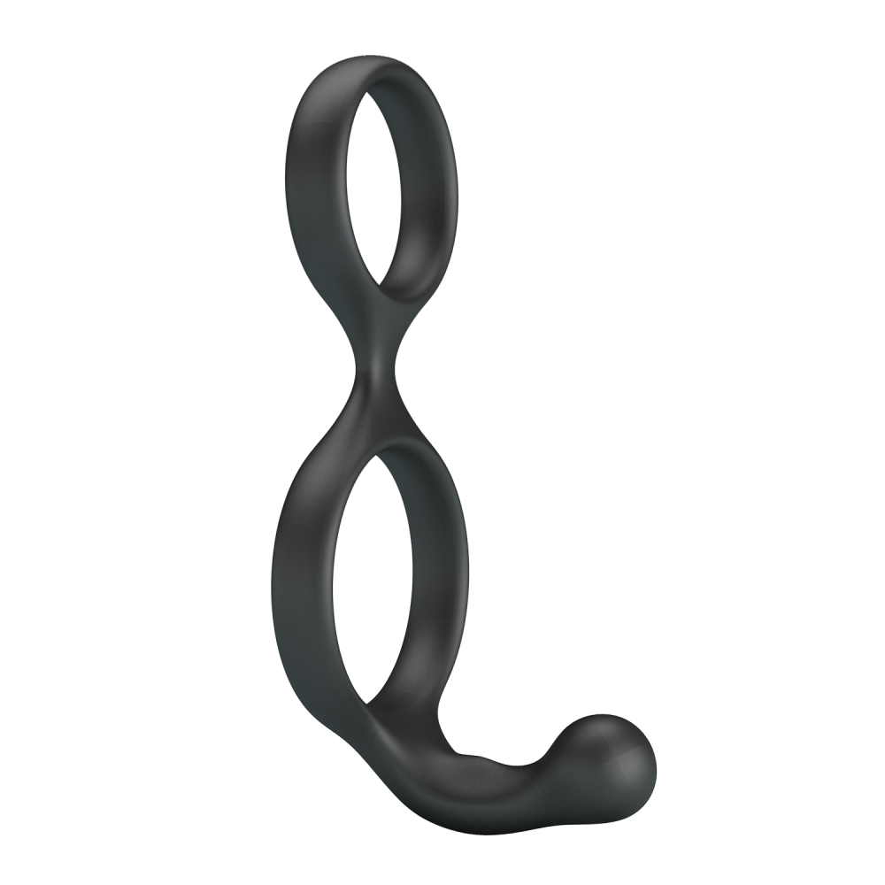 Двойное эрекционное кольцо с анальным стимулятором из мягкого силикона. Конструкция в форме цифры 8 включает два кольца разного диаметра, соединённых перемычкой, и изогнутый анальный отросток с закруглённым кончиком. Материал — высокоэластичный силикон, допускающий значительное растяжение без деформации. Изделие не требует зарядки или батареек. Цвет — чёрный. Вес брутто 60 г. Подходит для использования с лубрикантом на водной основе.