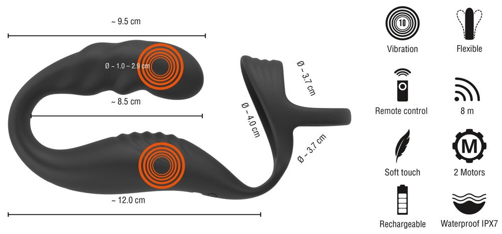 Комплексное удовольствие для пениса, промежности и простаты! Устройство от Rebel сочетает кольца для пениса и яичек с вибраторами для простаты и промежности. Эластичные кольца обеспечивают комфортную фиксацию, поддерживают эрекцию и позволяют использовать устройство во время секса. Два мощных мотора (в плаге и стимуляторе промежности) предлагают по 10 режимов вибрации, которыми можно управлять через пульт (до 8 м) или кнопку на устройстве. Водонепроницаемый, изготовлен из силикона с мягкой текстурой Soft Touch для комфорта и гибкости. Перезаряжаемый, в комплекте USB-кабель и батарея для пульта (CR2032). Длина пробки: 9,5 см. Глубина введения: 8,5 см. Диаметр пробки: 1–2,9 см. Длина стимулятора промежности: 12 см, ширина 3,6 см. Диаметр кольца для пениса: 3,7 см (эластичное). Диаметр кольца для яичек: 3,7 см (эластичное). Вес: 112 г. Материал: Силикон, полиуретан, ABS.