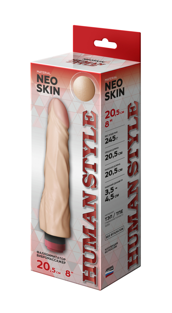 Реалистичный вибромассажер телесного цвета. Имеет форму члена с ярковыраженной головкой. Необычайно приятный, рельефный, выполненный из материала «Неоскин» , передающий эффект мягкой реалистичной текстуры кожи, не имеет швов. Характеристика: общая длина– 24 см, рабочая длина- 20,3 см, максимальный диаметр- 4,2 см, работает от 2АА батареек (нет в комплекте). Упаковка- картонная коробка с принтом.