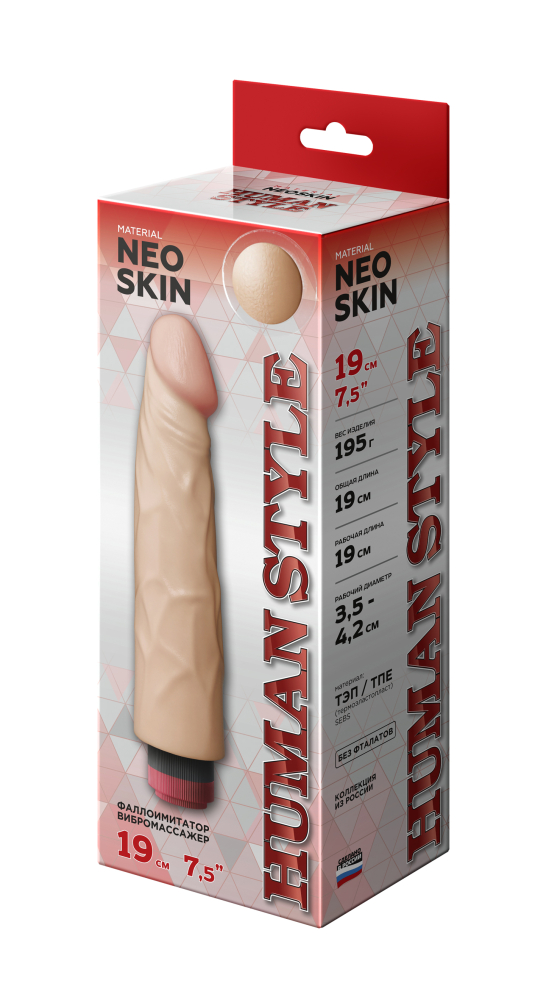 Реалистичный вибромассажер телесного цвета. Имеет форму члена с ярковыраженной головкой. Необычайно приятный, рельефный, выполненный из материала «Неоскин» , передающий эффект мягкой реалистичной текстуры кожи, не имеет швов. Характеристика: общая длина– 22,5 см, рабочая длина- 19 см, максимальный диаметр- 3,6 см, работает от 2АА батареек (нет в комплекте). Упаковка- картонная коробка с принтом.
