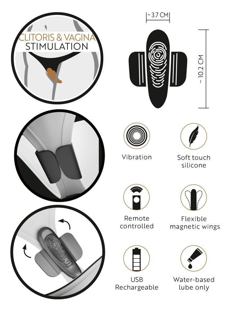 Вибратор в трусики с магнитными крылышками для крепления и 10 режимами вибрации обеспечивает целенаправленную стимуляцию клитора и губ вульвы. Тихие, но мощные вибрации можно регулировать одним нажатием кнопки с помощью пульта дистанционного управления — даже вашим партнером. Вибратор водонепроницаемый, подходит для использования в воде. Высококачественный мягкий силикон обеспечивает комфорт при ношении и стимуляции. Магнитные крылышки лучше фиксируют устройство в трусиках с узкой промежностью, в брюках или шортах фиксация может быть неустойчивой. Перезаряжаемый, USB-кабель и батарейка CR2032 для пульта в комплекте. Общая длина 10,2 см, ширина 3,7 см, высота макс. 3,1 см. Площадь стимулирующей конструкции 6 см × 2,2 см. Вес 56 г. Материалы: силикон, полиуретан, ABS.