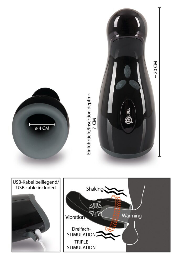 Три функции для полного наслаждения! Мастурбатор с тремя режимами сочетает вибрацию, нагрев и движение вверх-вниз. Управление осуществляется тремя кнопками, позволяющими использовать функции отдельно. Вибрация работает в 7 режимах, движение вверх-вниз — в 7 скоростях, нагрев достигает 40 °C. Внутренний рукав прочно интегрирован в корпус и не снимается. Перезаряжаемый — USB-кабель для зарядки входит в комплект. Общая длина 20 см, глубина введения 7 см, внутренний диаметр 4 см. Материалы: силикон с полиуретановым покрытием, ABS.