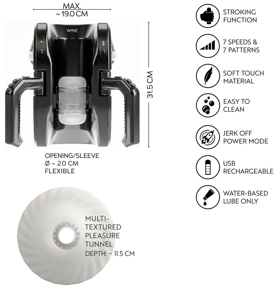 Мастурбатор интенсивно массажирует пенис благодаря функции вверх-вниз. Боковые ручки обеспечивают удобство и комфорт, позволяя наслаждаться полностью автоматическим массажем без усталости рук. Различные длины хода, режимы движения и скорости регулируются одним нажатием кнопки. Короткая длина хода увеличивает скорость для быстрой интенсивной стимуляции или турбо-финала. Светодиодные индикаторы помогают легко контролировать все функции. Мягкий нейтральный рукав с текстурой массирует пенис по всей окружности. Съёмную насадку можно использовать отдельно или для ручной мастурбации, а рукав легко снимается для очистки. Перезаряжаемый — USB-кабель для зарядки входит в комплект. Габариты 31,5 x 19 x 16 см, длина рукава 11,5 см, внутренний диаметр 2 см (растягивается). Вес 1 720 г. ABS, TPE.