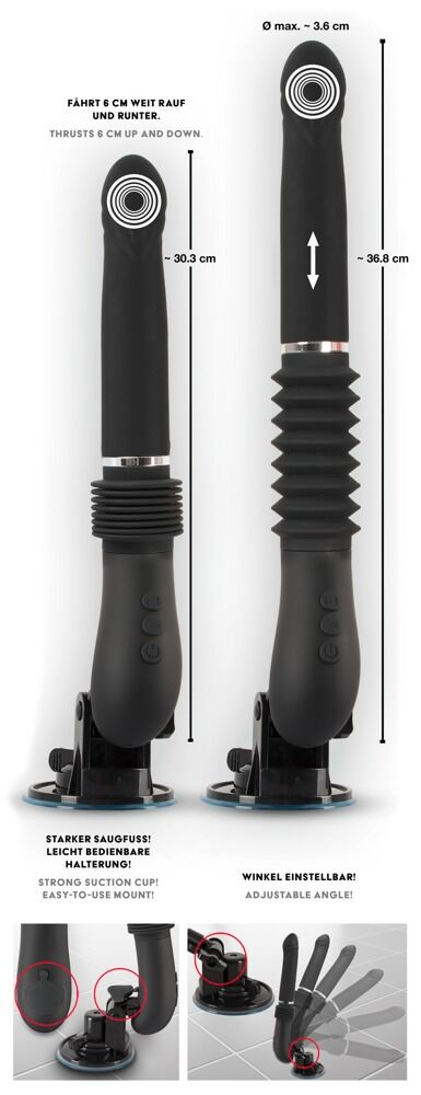 Мощный ударный вибратор с регулируемым основанием на присоске надежно фиксируется на любой гладкой поверхности и позволяет наслаждаться стимуляцией без помощи рук. Удлиненная конструкция обеспечивает дополнительную длину до 6 см для более глубоких и интенсивных ощущений. 7 режимов вибрации и 3 режима растяжения можно настраивать по отдельности или сочетать между собой. Управление осуществляется с помощью беспроводного пульта дистанционного управления, в том числе партнером. Мягкий, шелковистый силикон с выраженной головкой обеспечивает плавные, комфортные толчки и приятное скольжение. Вибратор и пульт дистанционного управления перезаряжаемые, зарядка осуществляется через USB-кабель. Общая длина: от 30,3 до 36,8 см Рабочая длина: 15 см Диаметр: от 3,1 до 3,6 см Вес: 323 г Материалы: силикон, полиуретан, ABS.