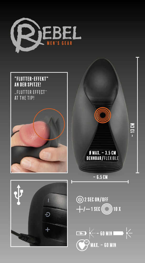 Удобный мастурбатор с гибкими крылышками надежно удерживает пенис и обеспечивает комфортную фиксацию даже в неэрегированном состоянии. Внутренние рельефные канавки интенсивно массируют головку и усиливают ощущения. 10 режимов вибрации легко переключаются с помощью кнопок + / –, позволяя точно настроить стимуляцию под настроение. Высококачественный силикон приятно ощущается на коже и делает использование особенно комфортным. Перезаряжаемый – USB-кабель для зарядки входит в комплект. Характеристики: Общая длина: 13 см, Ширина: 6,5 см, Внутренний диаметр: около 3,5 см, Вес: 186 г, Материалы: силикон, полиуретан, ABS.